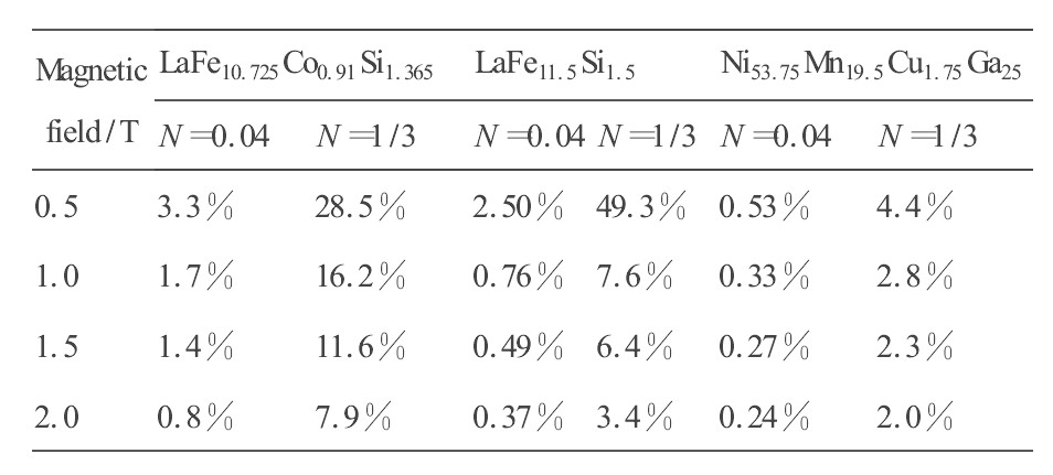 对发生二级磁性相变的LaFe10.725 Co0.91 Si1.365 材料以及发生一级磁相变的LaFe11.5 Si1.5 和Ni53.75 Mn19.5 Cu1.75 Ga25 材料在不同外场下磁熵变曲线的计算表明,在低场下(<2 T),退磁场对磁熵变数值有一定影响。长圆柱体材料退磁场很小,其实际磁熵变最接近无退磁场情况下的理论值;而球状材料退磁场很大,其实际磁熵变大大低于理论值。随外场的增强,退磁场对磁熵变的影响逐渐减弱。另外随温度升高退磁场的所带来影响逐渐减弱。若材料本身的磁熵变数值较大,则退磁场的影响相对较小。在实际制冷循环中,除了尽可能提高材料的磁熵变,还应尽量使材料形状接近退磁因子较小的长圆柱体而避免使用退磁因子较大的球体材料,以降低退磁场的影响,提高制冷循环的效率。