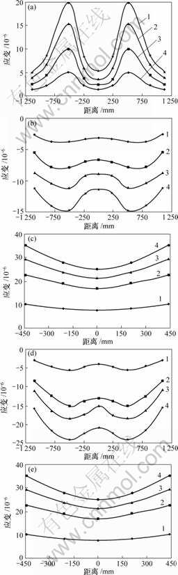 (a) A-A截面顶板应变分布;(b) B-B截面顶板应变分布;(c) B-B截面底板应变分布;(d) C-C截面顶板应变分布;(e) C-C截面底板应变分布