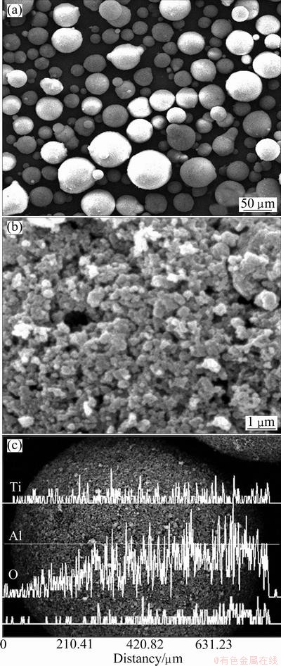 Fig. 1 SEM image (a), high magnification image of surface morphology (b) and line scanning result (c) of agglomerated Al2O3-13%TiO2 powders