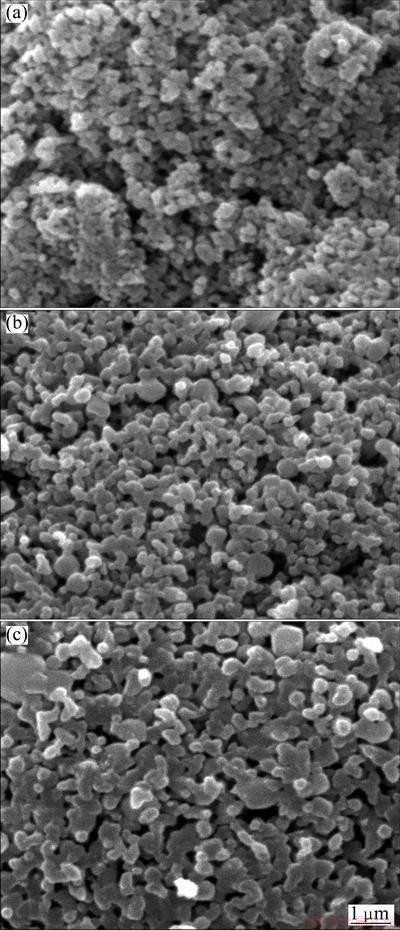 SEM images of agglomerated Al2O3-13%TiO2 powder sintered at different temperature are shown in Fig. 2. It demonstrates that the nano-particles grow into 100-300 nm in size, and the nano-particles connect together, indicating that sintering of the nano-particles occurs after the organic binder of PVA is burnt. As the sintering temperature increases, the nano-particles grow from nano-size to sub-micron or micron size, and more obvious necking exists between nano-particles due to sintering effect, which improves the strength of connection between nanoparticles, necessary for plasma spraying.