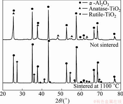 Figure 3 presents the XRD patterns of agglomerated Al2O3-13%TiO2 nanocrystalline powders before and after sintering. It can be seen that Al2O3 retains the same α phase as the raw material after sintering, while TiO2 changes from anatase to rutile due to an irreversible phase transition occurring at 610 °C [6]. And the reaction does not occur between alumina and titania to generate a new phase.