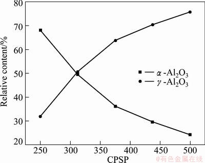 Fig. 5 Relative contents of α-Al2O3 and γ-Al2O3 in nanostructured Al2O3-13%TiO2 coating as function of CPSP