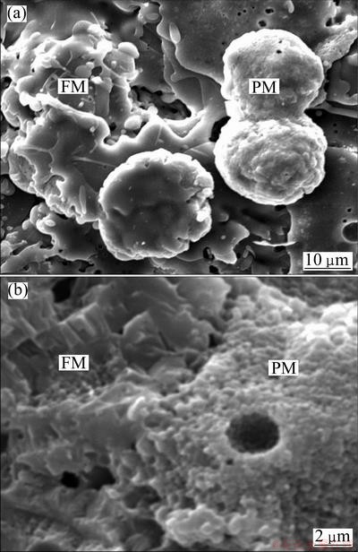 Figure 6 presents SEM images of the cross-section of the nanostructured Al2O3-13%TiO2 coatings sprayed at different CPSP. In all the coatings, some pores are observed because of the technology characteristics of plasma spraying. And the nanostructured coatings all exhibit a particular bimodal microstructure feature, consisting of unmelted or partially melted regions (bright-gray colored, marked with PM in Fig. 6) and fully melted regions (dark-gray colored, marked with FM in Fig. 6). During the process of plasma spraying, a large amount of nanoparticles are fully melted because of high temperature of flames (more than 104 K). These melting droplets struck the surface of the substrates or the as-sprayed coatings to form micron-sized lamellar structure under the action of high speed flames. Simultaneously, high speed flames are too fast to melt a part of nanoparticles completely, hence forming the partially melted regions consisting of nanoparticles. Therefore, the as-sprayed nanostructured ceramic composite coatings are composed of lamellar structure and partially unmelted nanoparticles, which can be clearly and detailedly seen from Fig. 7. It is believed that the unique bimodal microstructure contributes to the significantly enhanced mechanical properties of the nanostructured coatings.