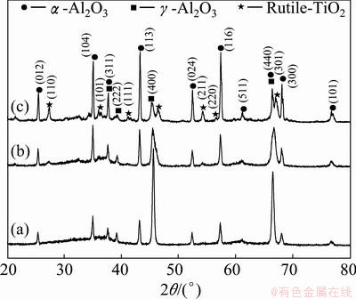 Fig. 8 XRD patterns of Al2O3-13%TiO2 coating (a) and heat treated coatings at temperatures of 900 °C (b) and 1000 °C (c)
