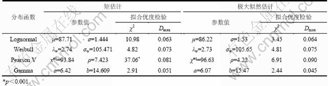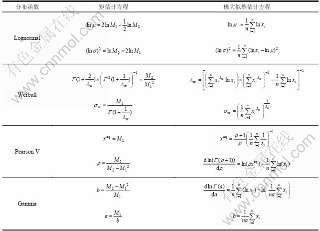 本文采用矩估计和极大似然估计2种方法对母体分布函数进行参数估计。矩估计是一种最简单的参数估计方法,利用样本的各阶原点矩来估计理论分布的各阶原点矩[15],极大似然估计是基于极大似然原理的参数估计方法[16],采用最小二乘法求解参数,4种函数的矩估计方程和极大似然估计方程见表2。