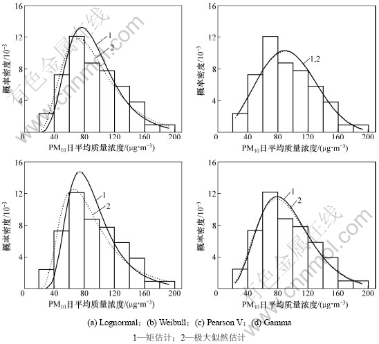 本文使用4种理论母体分布函数拟合PM10的日平均质量浓度整体分布,包括:对数正态分布,韦伯分布,皮尔逊分布和伽马分布(表达式见表1)。4种母体分布函数的表达式中均含有2个参数,参数值需根据被拟合的实际样本估计,估计方程见表2。