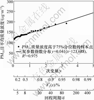 确定双参数指数分布的参数之后,可得PM10高于某质量浓度xc发生的频率1-F(xc)和回程周期T(xc)[14]: