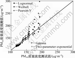 图5所示为母体分布函数和双参数指数分布函数对高质量浓度样本的预测值比较结果。从图5可以看