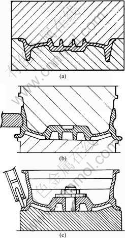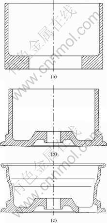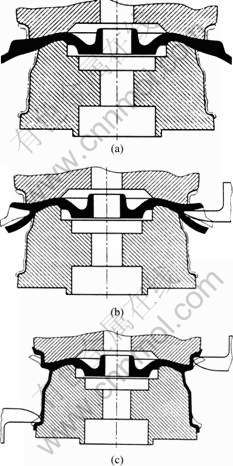 Fig.5 Schematic diagram of extrusion process: (a) Extruding can; (b) Forging front lip; (c) Expanding rim and back lip