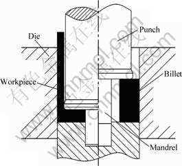The maximum load was chosen as the extrusion load during extrusion process. A new concept of hollow billet was proposed and a method of extrusion from hollow billet was developed[16]. The schematic diagram of extrusion from hollow billet is shown in Fig.3.