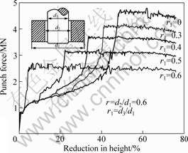To investigate the press force during extrusion from hollow billet, the finite element simulation was conducted using an implicit FE code MSC/Autoforge. The data on AZ80 alloy flow stress as function of strain, strain rate and temperature established based on compression experiment have to be introduced into the FE package. Fig.4 shows the calculational force— displacement curves during extrusion from hollow billet at different r1=d3/d1, where d1 is outside diameter of hollow billet; d2 is inner diameter of hollow billet; and d3 is diameter of mandrel. The results show that forming force is decreased enormously during extrusion from hollow billet, because of the decrease of contact area and