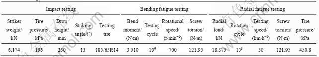 The mechanical properties are remarkably improved for AZ80+ alloy wheel extruded in the both rim and disc section. The ultimate tensile strength is 300-320 MPa and the elongation is above 10%. For example, the mass of (14×6) J wheel is 5.2 kg representing 28% mass saving of aluminum wheel. The impact testing, radial fatigue testing and bending fatigue testing results in Table 1 show that the magnesium wheels can meet application requirement in automobile industry.