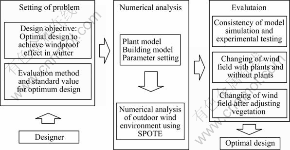 Figure 1 shows the flow of the optimal vegetation design system for improving wind environment in residential areas using numerical simulation and field experiment. This optimum design system was composed of the following three stages: 1) Initially, an optimization problem was established by the designer; 2) Next, numerical analysis was performed on the outdoor wind environment using SPOTE; 3) Thirdly, by consistency of model simulation and experimental testing, the influences of vegetation on wind environment were investigated, and the optimum solution candidates and the optimum process were examined. Hence, as the first step, the design objective and evaluation method were determined in these stages. In the second stage, models including vegetation and buildings were used to analyze the outdoor environment. In the third stage, in order to investigate the influence of vegetation on wind field, numerical simulations were carried out. Further, the optimal design of vegetation was examined for improved wind environment in winter. Thus, the optimal vegetation design for comfortable wind environment was carried out.