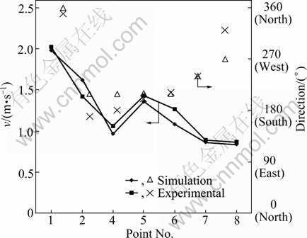 Fig. 4 Comparison of wind velocity and direction between experiment and simulation
