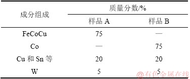 分别将FeCoCu预合金粉和单质Co粉按重量要求装入石墨模腔,置于国产真空热压烧结炉中进行热压烧结,得到长×宽×高为30 mm×12 mm×6 mm的预合金粉烧结体试样。热压炉真空度为0.1 Pa,FeCoCu预合金粉烧结温度为840 ℃,Co粉烧结温度为880 ℃,保温保压时间和烧结压力两者都相同,分别为4 min和25 MPa。