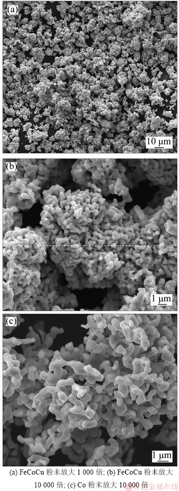 图1所示为共沉淀法FeCoCu预合金粉与H2还原法单质Co粉的SEM形貌,其中图1(a)所示为FeCoCu放大1 000倍SEM图,图1(b)和图1(c)所示分别为FeCoCu和单质Co放大10 000倍SEM图。图2所示为FeCoCu预合金粉的XRD图谱。由图1可知:FeCoCu预合金粉末和单质Co粉末的外形基本相同,都为近球形,粉末颗粒表面光滑,颗粒间形成聚合体,一次颗粒FeCoCu粉末的粒径为0.5~1 μm,Co粉的粒径为1~2 μm。粉末聚合体是指一次颗粒通过聚合形成的二次颗粒,一般有团粒和絮状体2种形式,低倍数下2种粉末都为团粒状,高倍数下都为絮状体。