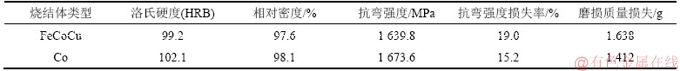 表3所示为FeCoCu预合金粉和单质Co粉分别在各自最佳烧结工艺时烧结后的试样的机械性能,包括硬度、三点抗弯强度、相对密度、强度损失率、磨损质量损失等。