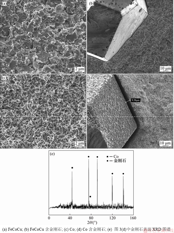 图3所示为FeCoCu预合金粉和单质Co粉不含金刚石胎体的断口SEM图及金刚石界面SEM图。