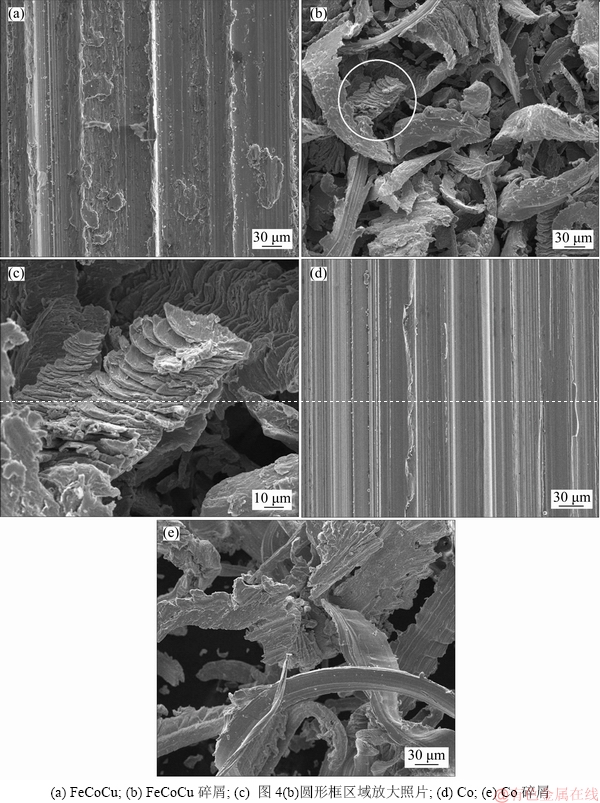 图4所示为FeCoCu预合金粉和单质Co粉烧结体分别与标准砂轮对磨后,烧结体被磨削表面和磨削产生的碎屑SEM图。由图4(a)和图4(d)可知:FeCoCu烧结体试样被磨削表面单个磨粒切削槽宽度在60~70 μm之间,稍大于单质Co烧结体试样的切削槽宽度(40~50 μm),FeCoCu试样被磨削表面有少量的碎屑粘连,而单质Co试样被磨削表面切削槽边界光滑,表面无碎屑粘连现象。从图4(b)和图4(c)可知:FeCoCu试样被磨削的碎屑既包括长条状整体碎屑,也包括图4(b)圆圈内放大图所示的鱼鳞状堆积的块体,而单质Co试样被磨削的碎屑主要为长条状整块碎屑。以上现象的产生也是与烧结体试样的物理力学性能相关联的,FeCoCu烧结体试样的硬度较单质Co烧结体试样的硬度低,标准砂轮的磨粒压入试样表面深度更深,因此切削槽宽度更大,这也是FeCoCu烧结体试样磨损质量损失比单质Co烧结体试样稍高的原因;另外,由于FeCoCu烧结体合金成分具有一定的脆性,在与标准砂轮对磨时产生的碎屑因为材料的脆性而更易断裂,从而形成碎屑堆积的块体,而单质Co烧结体材料韧性相对更好,碎屑不易断裂,因而形成长条状整块碎屑体。
