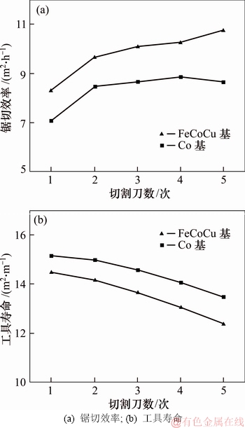 4) 2种绳锯样品锯切效率都呈整体上升的趋势,工具寿命都呈逐渐降低的趋势,FeCoCu基胎体绳锯平均锯切效率达到9.8 m2/h,相对于Co基胎体绳锯提高了16.7%,理论寿命达到13.6 m2/m,相对Co基胎体绳锯只降低6.2%,而FeCoCu预合金粉相对于Co粉原材料成本降低,产品性价比优势更加明显。