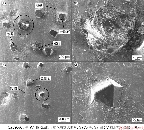 从图6(a)和图6(b)可以看出:FeCoCu基胎体中,金刚石磨粒沿切削方向,其两侧有较深的沟槽,磨粒后端“蝌蚪状”支撑也较为明显,胎体对金刚石磨粒的包镶完整无缝隙,部分金刚石有破碎的形态;Co基胎体金刚石磨粒两侧沟槽相对较浅,胎体对金刚石的包镶完整无缝隙,但出刃高度相对较小,金刚石磨粒基本无破碎现象。由于2种串珠的金刚石参数设计完全相同,因此,串珠表面锯切后的形貌特征是与胎体性能密切相关的,而金刚石工具胎体性能在添加剂成分组成相同情况下,是由骨架相成分的性能所决定的[25]。FeCoCu烧结体的磨损质量损失比Co烧结体的高,因此,FeCoCu基胎体耐磨损性能比Co基胎体的低,故串珠表面沟槽相对较深,根据前述hc计算公式及胎体设计理论,属于胎体磨损稍快于金刚石磨损的情形。由于FeCoCu对金刚石包镶能力较强,金刚石不易脱落,因此,金刚石出刃高度相对较高,提高了金刚石的“容屑空间”[26],绳锯切割效率得到提升。正是因为金刚石出刃高,锯切石材时金刚石磨粒受到的力矩更大,当力矩大于金刚石的断裂强度时,金刚石易产生破碎,且金刚石断裂方向沿锯切作用的反方向,如图6(b)所示。由于FeCoCu基胎体耐磨损性能比Co基胎体的稍低,且金刚石破碎比例相对较高,因此,其工具寿命比Co基胎体的低。综上所述,串珠表面形貌与其锯切性能是相对应的,同时,在其他条件相同时,串珠胎体骨架相成分的机械性能与工具锯切性能有一定的关联关系,通过研究骨架相成分的机械性能,能预判工具的锯切性能,也可为骨架相成分的设计特别是代Co预合金粉末的设计提供理论依据。