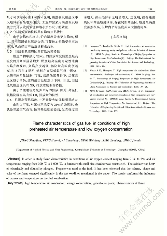 Key words:high temperature air combustion; energy conservation; greenhouse gases; characteristics of flame