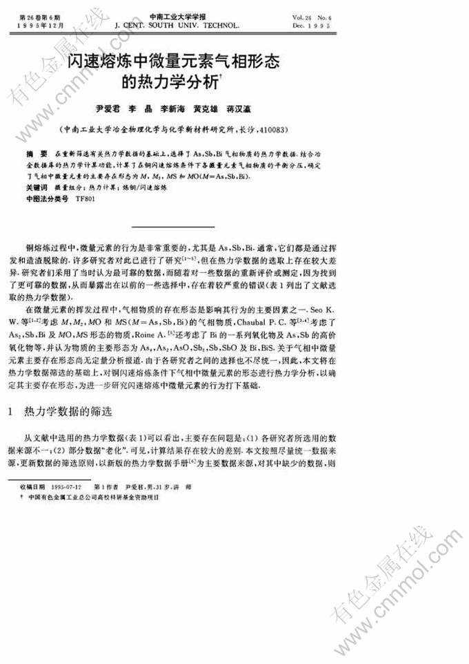 Abstract: Thermodynamic data for As,Sb,Bi and their oxide and sulfide gases have been critical-ly reviewed and compiled.The partial pressure of each species was calculated by the functionof metallurgical database system,and the predominant gaseous species in the condition offlash smelting were determined as M,M2,MO and MS(M=As,Sb,Bi)。