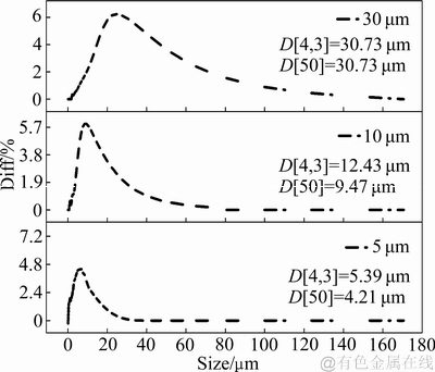 PEO实验使用哈工大WHD-20型微弧氧化电源进行,电参数如下:电流密度15 A/dm2、频率500 Hz、占空比50%、双极性直流脉冲输出方式、氧化时间40 min。氧化中,试样作阳极,70 mm×70 mm×5 mm不锈钢板作阴极,两极间距为120 mm。电解槽使用循环水冷玻璃槽,实验过程通过DC-0510型低温冷却机使等离子体氧化过程始终保持在15 ℃以下进行。电解液采用硅酸盐和磷酸盐混合电解液,并添加不同含量及不同粒径的HBN颗粒。其中,HBN颗粒的平均粒径分别为5、10和30 μm,其粒径分布如图1所示;颗粒均经碱蚀液碱洗后在电解液中进行超声分散,HBN的添加浓度分别为2、4和6 g/L,氧化过程全程机械搅拌。