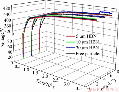 图2 不同尺寸和浓度HBN颗粒复合的PEO过程槽电压 曲线