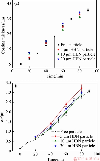图3 4 g/L浓度下不同尺寸HBN颗粒复合的PEO膜生长曲线和粗糙度变化曲线