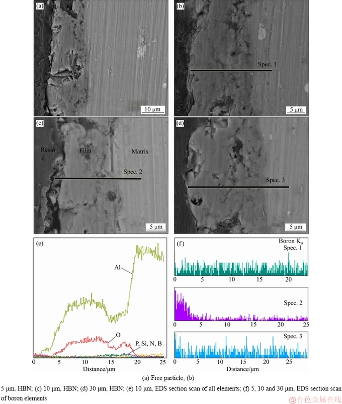 图6(a)~(d)所示为不同PEO复合膜截面SEM形貌;图6(e)所示为10 μm HBN颗粒复合下PEO膜的截面EDS线扫谱,图6(f)所示为不同粒径HBN颗粒复合时PEO膜中B元素沿截面分布曲线。如图6(a)~(d)所示,基础电解液中制备的PEO膜内部存在较大的裂纹和孔隙,且这些缺陷几乎贯穿整个膜层;复合5、10和30 μm HBN颗粒后,由于加速击穿导致火花放电阶段的延长,内部氧化物不断重熔烧结,内部孔隙不断被其填充,导致膜厚和致密度均有所增加。通过对各复合膜的截面EDS线扫描发现,Si、P、Al、O元素分布较未复合的膜层无显著变化,5 μm和30 μm HBN颗粒复合的PEO膜截面几乎无法检测到BN颗粒,10 μm HBN颗粒复合下才在膜层近表面检测到了少量的B元素,如图6(e)~(f)所示。因此,BN颗粒除了在膜表面进行物理沉积以外,适中粒径的颗粒(约10 μm)因短时高温发生表层溶解,且被熔融氧化物包裹于膜层近表面层;尺寸较小的BN颗粒(≤5 μm)由于较高的击穿温度完全发生熔融,故而此涂层中B元素无明显聚集,如图6(f)中Spec.1所示;而较大的BN颗粒(≥30 μm)虽存在复合的可能,但受膜厚限制,氧化物不能完全包裹BN颗粒,因此该涂层内部几乎无B元素存在,如图6(f)中Spec.3所示。
