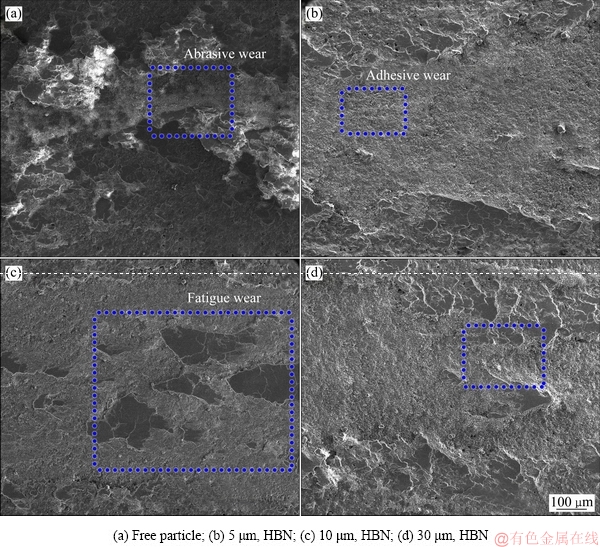 图9 不同尺寸HBN颗粒复合的PEO膜与Si3N4球对磨的磨损SEM像