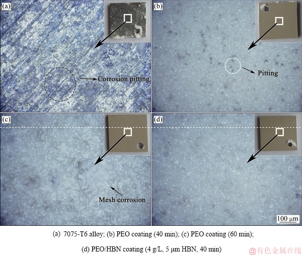 此外,通过Mocledon模拟海水浸泡实验进一步对比了PEO膜、PEO/HBN复合膜的耐腐蚀性能,图11所示为不同试样浸泡1800 h后的表面OM形貌。可以明显看出:7075-T6合金表面产生了大量白絮状腐蚀产物,微观表面均分布着大量的黑色腐蚀斑,耐蚀性很差,如图11(a)所示;当7075合金表面覆盖了PEO涂层之后,试样的腐蚀倾向大幅降低;无论复合HBN与否,PEO膜浸泡1800 h后表面都只有少量局部絮状腐蚀斑或者蚀孔,耐蚀性大大优于7075铝合金基体的。然而,不同结构的氧化膜耐蚀性存在一些显著差异。对比图11(b)和(c) 可知,并非氧化时间越长PEO膜层的耐蚀性就好,PEO膜的耐蚀性与膜层结构之间关系更为密切;PEO时间过长时,膜层表面放电微孔孔径增大,Cl-等腐蚀介质更易进入膜层从而接触到基体,加速膜层腐蚀,因而该试样表面的腐蚀程度略重于氧化40 min的试样,表面存在局部网絮状的腐蚀斑。而从图11(b)和(d)可以看出,在相同的氧化时间(40 min)下,HBN颗粒复合的PEO膜层耐蚀性更佳;未复合的PEO膜浸泡1800 h后,表面存在一定数量的黑色蚀孔(见图11(b)),而PEO/HBN复合膜浸泡后表面蚀点数量明显更少(见图11(d)),这也进一步说明致密的膜层结构有助于改善PEO膜层的耐蚀性。