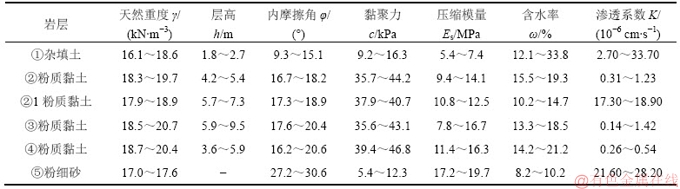 哈尔滨地铁1号线三期工程同哈区间起讫里程为SK12+759.427~SK14+046.663,区间长为1 287.236 m,隧道埋深为12.208~12.280 m。该隧道所在地层自上而下依次为:以杂填土为主的全新统人工堆积层(Q4ml),以粉质黏土为主的上更新统哈尔滨组冲洪积层(Q32hral+pl)、中更新统上荒山组湖积层(Q22hl),以粉质黏土、粉细砂为主的中更新统下荒山组冲积层(Q21hlal)。隧道埋深及地质剖面如图1所示。隧道开挖区域主要集中在以粉质黏土为主的中更新统上荒山组湖积层(Q22hl)内,隧道地勘资料表明,该层土质较均匀,压缩性中等,属V类围岩,位于地下水上方,基本处于低渗硬塑状态。土体物理力学参数见表1。