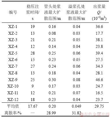 为明确浆液在粉质黏土中的扩散范围,采用原始设计方案对土体进行稳压注浆,待浆液凝固后揭露周围土体查看浆液扩散情况,对选定小导管试验数据统计,见表2。