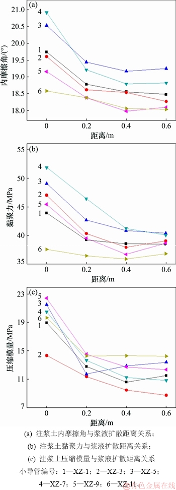 Fig. 5 Relationship curves between grouting soil mechanical parameters and slurry diffusion distance