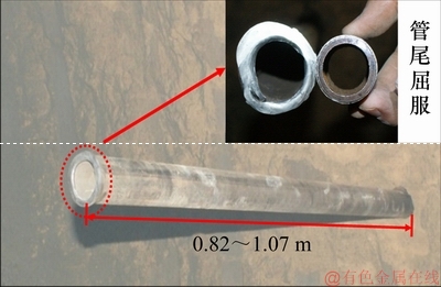 由图6可知:小导管最终施打长度不超过2.2 m,而超前支护设计方案中要求小导管每隔两榀格栅钢架施作1环,相邻2排小导管的水平投影搭接长度不小于1 m,可知小导管有效施打长度至少要超过2.6 m,但现场试验结果表明有将近1/3设计长度的小导管直到管尾屈服也无法打入土体(图7),而表2统计结果也表明浆液在土体中扩散范围较小,仅为0.2~0.4 m,这就导致相邻小导管在纵向上有效搭接长度不足或不搭接,相邻小导管注浆加固体在横向上有效贯通厚度不足或不贯通,造成围岩荷载在搭接区域易出现压力释放奇点,出现三角压密区土体“掉块”现象,造成塑性区进一步扩大,反而不利于隧道整体稳定。