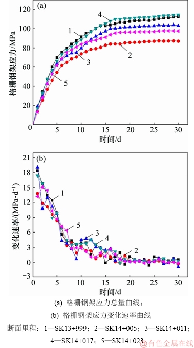 图11所示为拱顶处格栅钢架应力实测曲线。由图11可知:前5 d,格栅钢架应力急剧增加,基本与围岩压力同步激增,其变化速率最大值也达到18 MPa/d,显示格栅钢架在一开始就迅速发挥关键性的支护作用,体现其在初期支护中的骨架作用[17];第6~15天,钢架应力缓慢增加直至达到稳定值,应力变化速率迅速降低到0附近,表明以格栅钢架作为承载骨架的初期支护与围岩压力达到动态平衡;15 d后钢架应力基本达到稳定,与围岩压力实测曲线基本吻合。对比不同超前支护形式的格栅钢架应力及变化速率曲线增长规律,可以看出超前支护对格栅钢架应力的“主动”调控作用是不明显的,二者未形成有效地联合承载支护体系。