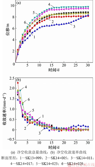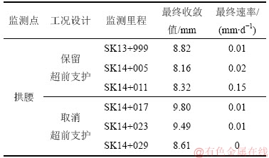 各断面收敛实测值见表3。除断面SK14+011收敛速率接近规范[18]规定的围岩基本稳定判别标准0.2 mm/d外,其余断面净空收敛总量与收敛速率已经基本稳定。净空收敛及收敛速率如图12所示。