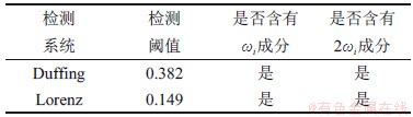 用龙格-库塔法对各系统进行数值求解,得到状态变量的集合。在对输入Lorenz系统的信号求解后得到关于状态变量x的解集后,去掉前期部分数据,判断剩下的解集中是否有超出阈值xd的解出现,Lorenz系统的xd=0。若有,则自动判定待测频率信号的存在。通过判断吸引子形状是否发生阶跃变化,判定待测信号是否含有特定成分。记录检测结果。表1所示为Duffing和Lorenz系统的参数阈值设置与检测结果。