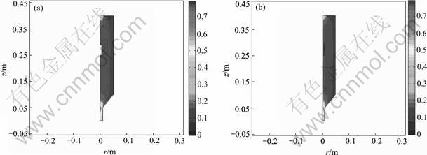 Fig.1 shows flow field contours in ICVI reactor. It is shown from Fig.1(a) that no flow field exists in preform because the viscous transport and pressure gradient imposed on the preform are neglected and the outer surface of preform is set to the no-slipping boundary conditions in case 1. Whereas, in case 2, the viscous transport and pressure gradient in preform were taken into account, which leads to the velocity in preform not equal to zero though the values are with the magnitude of 10-3 m/s as shown in Fig.1(b).