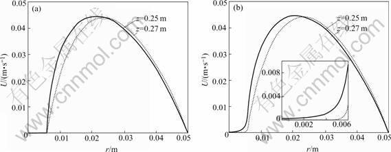 Fig.2 shows the velocity profiles along cross section of z=0.25 m and z=0.27 m for case 1 and case 2 respectively. Cross section of z=0.25 m represents the upstream surface of preform and that of z=0.27 m represents the middle cross section of preform. From the comparison of the two figures, it is clearly shown that the velocity in preform in case 1 is strictly limited to zero, while that in case 2 is trivial but not equal to zero. The insert in Fig.2(b) highlights the velocity profiles in preform in case 2. The velocity at preform surface is higher than that at preform center in case 2 because there is more and more momentum lose from edge to center of preform due to the barrier effect of porous preform imposed on reagent gases. The maximum velocity in preform is only 9.554×10-3 m/s.
