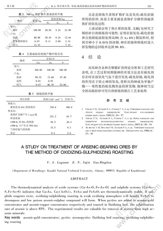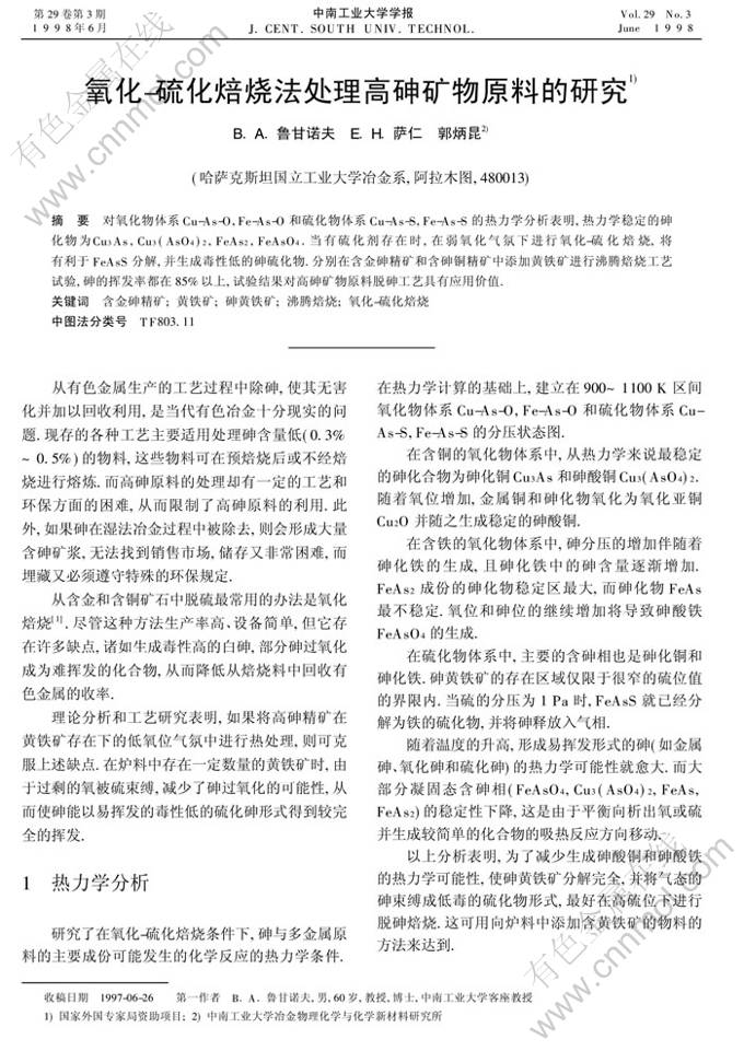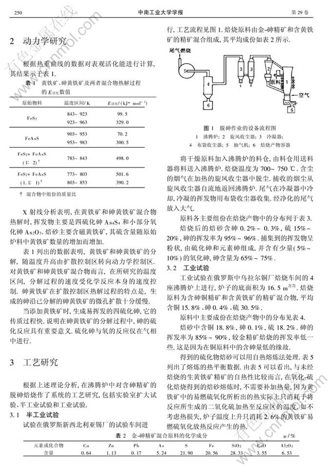 Key words:arsenic-gold concentrates; pyrite; arsenopyrite; fluidizing bed roasting; oxidizing-sulphidizing roasting