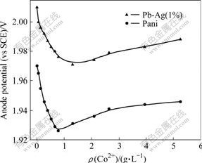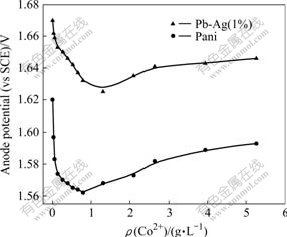 Combining the anode potential and cathode potential, the overall change in the cell voltage with increasing concentrations of added Co2+ is shown in Fig.2. The trend in the cell voltage is nearly the same for both the anodes with an initial decrease as the added Co2+ increases from 0.026 3 to 0.789 g/L and a small increase in cell voltage at higher concentrations. However, the cell voltage obtained using the Pani anode was always lower than that observed on the Pb-Ag anode in accord with open circuit potentials.