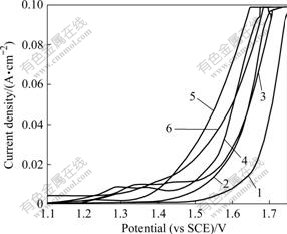 Fig.3 Anodic potentiodynamic curves on Pani anode in the presence of added Co2+: 1—0 g/L; 2—0.1315 g/L; 3—0.263 g/L; 4—0.394 g/L; 5—0.789 g/L; 6—1.578 g/L (ρ(Cu2+)=40 g/L; ρ(H2SO4)=170 g/L; θ=(45±1) ℃; v=10 mV/s)
