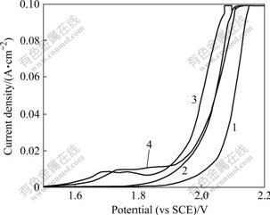 Fig.4 Anodic potentiodynamic curves on Pb-Ag anode in the presence of added Co2+: 1—0 g/L; 2—0.526 g/L; 3—1.315 g/L; 4—2.104 g/L (Other conditions same as in Fig.3)