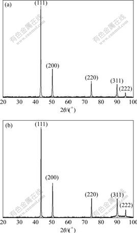 Fig.5 XRD patterns of copper electrowinning in the presence of added Co2+: (a) Nil; (b) 0.789 g/L (ρ(Cu2+)=20 g/L; ρ(H2SO4)= 30 g/L; θ=(30±1) ℃; anode substrate, Pani; td=3 h)