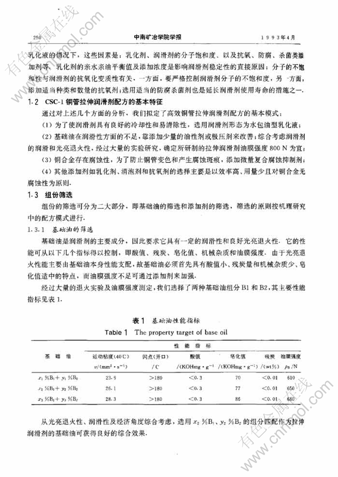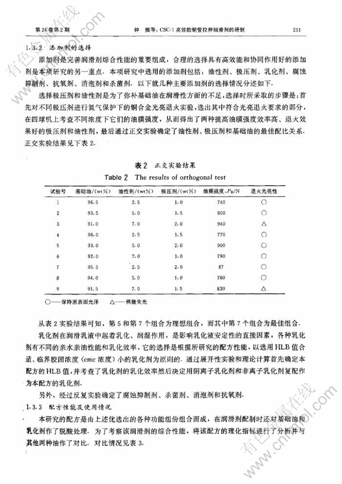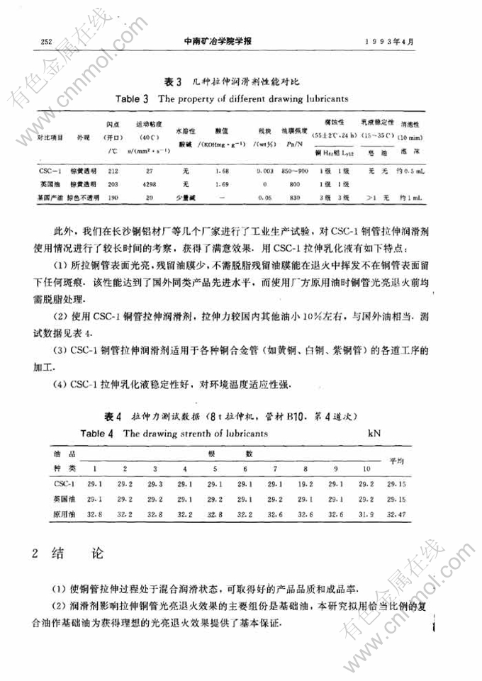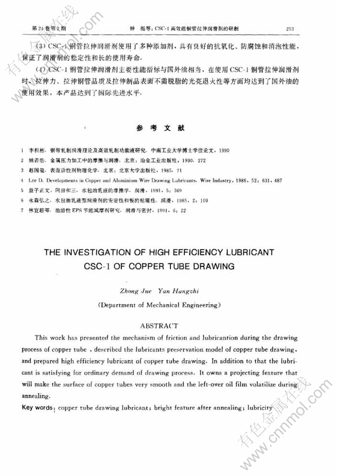 摘 要:通过理论分析和实验研究,查明了铜管拉伸摩擦润滑剂机理,提出了铜管拉伸工艺润滑剂配方模式,并研制了CSC-1高效拉伸润滑剂,该润滑剂除了能满足拉伸过程一般要求外,还具有所拉铜管表面光亮、残留油膜不需脱脂能在退火中挥发的突出特点。