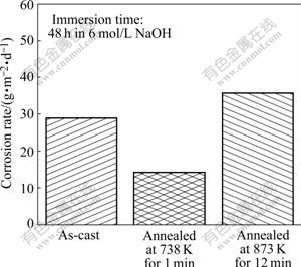Fig.3 Corrosion rates of as-cast and annealed samples in 6 mol/L NaOH solution