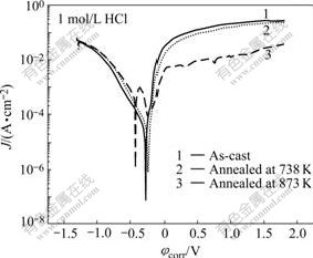 Fig.4 Potentiodynamic polarization curves of as-cast and annealed samples in 1 mol/L HCl solutions at 298 K open to air